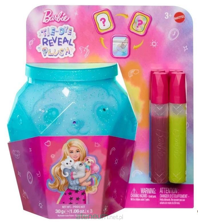 Z zestawem kreatywnym Barbie Tie-Dye Reveal, możesz wciąż od nowa tworzyć własne barwne przytulanki. W każdym pojemniku jest mięciutki przyjaciel (17.5 cm) do przytulania oraz wszystko, czego potrzeba, by zmienić jego wygląd. W zestawie są trzy buteleczki ze zmywalnym tuszem i jedna pusta na wodę. Wystarczą cztery proste kroki, aby pomalować schowane w pojemniku zwierzątko.