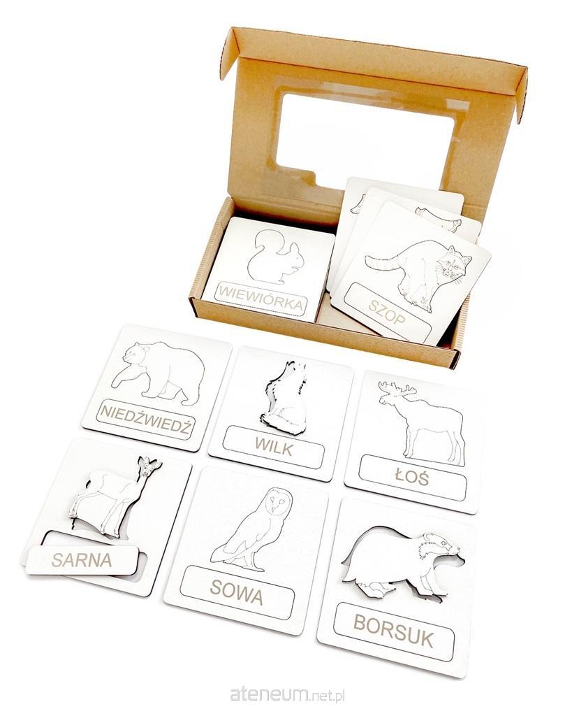 Zawiera 45 elementów (15 tabliczek z wyciętymi kształtami, 15 kształtów, 15 nazw kształtów).
