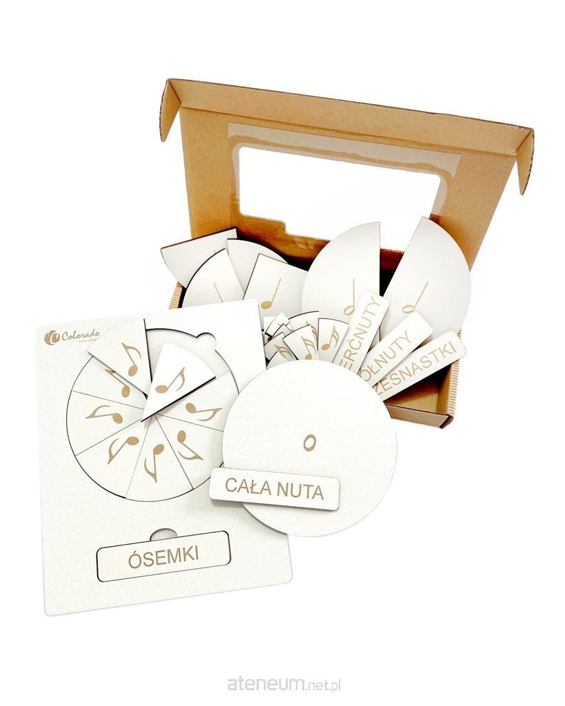 Zestaw składa się z tabliczki drewnianej z wygrawerowanymi laserowo wartościami rytmicznymi nut oraz ich nazwami.