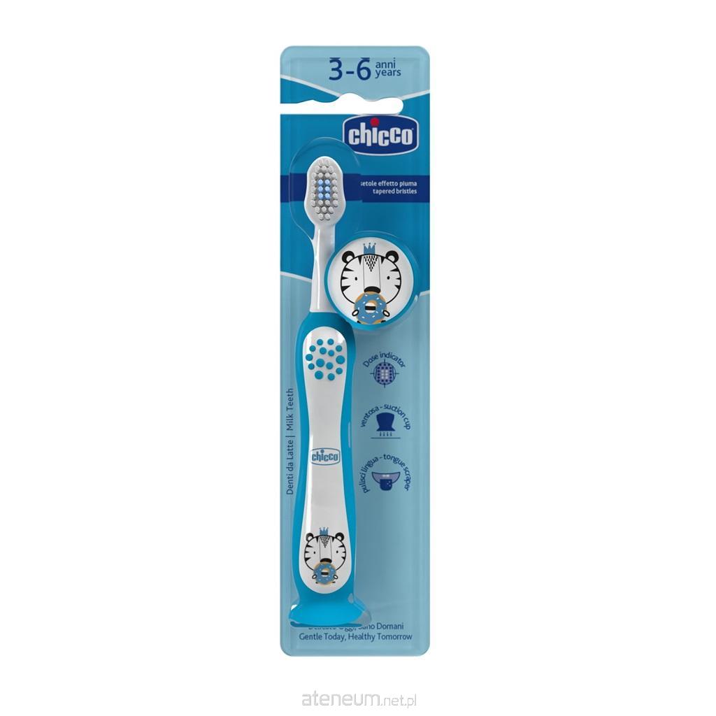 Nowa szczoteczka do zębów Chicco, stworzona specjalnie dla dzieci w wieku od 3 do 6 lat, to gwarancja kompleksowej opieki nad delikatnymi zębami i dziąsłami Twojego malucha. Nasza szczoteczka to produkt, który towarzyszy w codziennej higienie jamy ustnej, zapewniając nie tylko czyste zęby, ale także ochronę delikatnej tkanki dziąseł i szkliwa. Zaawansowana technologia i najwyższa jakość materiałów gwarantują kompleksową pielęgnację już od pierwszych lat życia. Bardzo miękkie włosie o stożkowatym kształcie, z bardzo cienkimi końcami - do delikatnego czyszczenia szkliwa, wrażliwych dziąseł oraz trudno dostępnych przestrzeni międzyzębowych. Główka szczoteczki posiada włosie oznaczone innym kolorem, co ułatwia kontrolę ilości pasty do zębów potrzebnej do skutecznej higieny jamy ustnej. Główka szczoteczki została specjalnie zaprojektowana z myślą o najmłodszych - wyposażona w czyścik do języka, zapewniającą kompleksową higienę jamy ustnej Twojego dziecka. Dodatkowo, ergonomiczny i antypoślizgowy uchwyt sprawia, że korzystanie z naszej szczoteczki jest łatwe i bezpieczne, nawet dla małych rączek. Codzienna higiena jamy ustnej to kluczowy nawyk, który warto wprowadzić już od najwcześniejszych lat. Daj swojemu dziecku najlepszy start w dbaniu o zdrowie jamy ustnej dzięki szczoteczce do zębów Chicco. Odkryj nowe standardy pielęgnacji zębów już dziś! CECHY: Miękki, stożkowy kształt włosia z bardzo cienkimi końcówkami zapewnia delikatne działanie na szkliwo i wrażliwe dziąsła* Główka szczoteczki z czyścikiem do języka Główka szczoteczki z zaznaczonym innym kolorem włosiem, który wskazuje na odpowiednią ilość pasty do zębów do nałożenia Ergonomiczny, antypoślizgowy uchwyt Zabawne wzory zwierząt na rączce szczoteczki Dopasowana, wygodna osłonka na główkę szczoteczki * Badania przeprowadzone w celu oceny skuteczności usuwania płytki nazębnej z przestrzeni najmniej dostępnych dla szczoteczek potwierdzają, że włosie z technologią stożkową jest bardziej skuteczne w usuwaniu kamienia nazębnego, dzięki ułatwionemu dostępowi do przestrzeni dziąsłowych w porównaniu do tradycyjnych włosi, zapewniając jednocześnie większą przyjemność użytkowania.