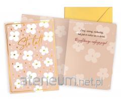 W środku kartki znajdują się krótkie starannie dopasowane życzenia z miejscem na własną dedykację.