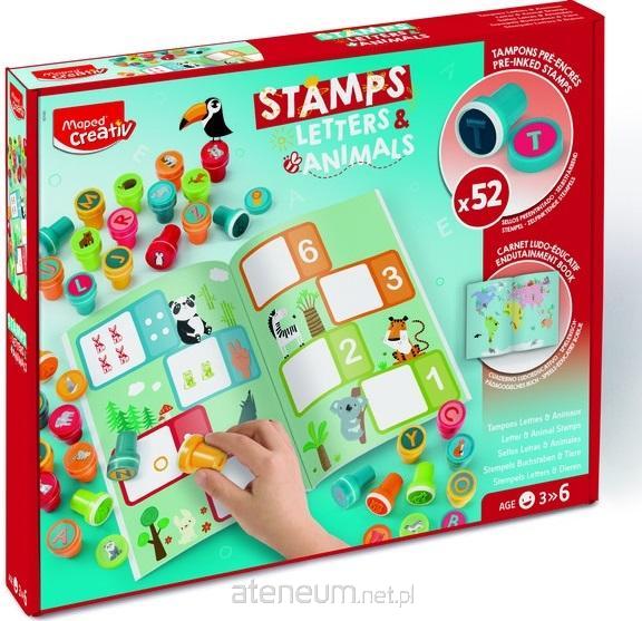 26 stempli ze zwierzątkami w 5 kolorach (żółty, czerwony, zielony, pomarańczowy i turkusowy), 26 stempli z literkami w 4 kolorach (żółty, czerwony, pomarańczowy i turkusowy)