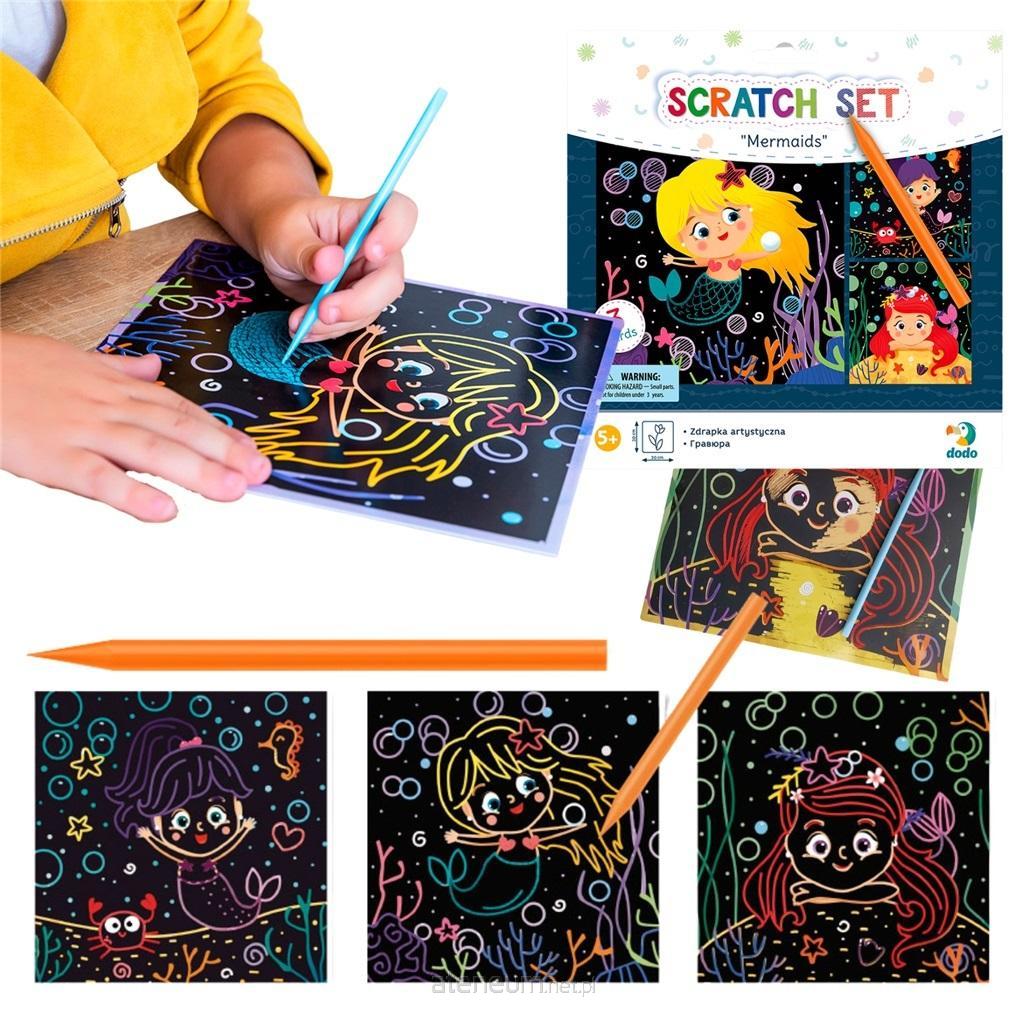 Trzy kolorowe kartki przedstawiają grafiki z pięknymi syrenkami, tworząc wspaniałe i pełne kolorów kompozycje. Dzieci mogą używać długopisu do zdrapywania obszarów, odkrywając tajemnicze obrazy pod powierzchnią. To nie tylko wspaniała zabawa, ale również sposób na rozwijanie zdolności manualnych, koordynacji ruchowej i wyobraźni.