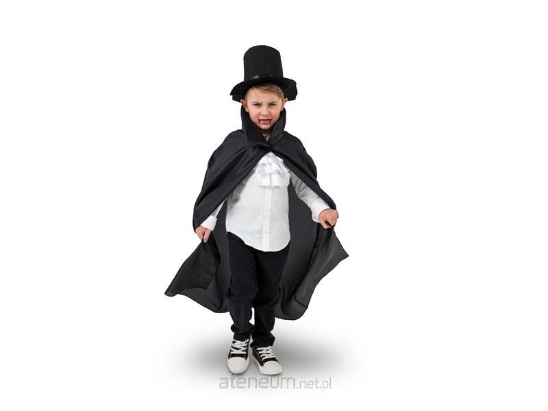 Strój dziecięcy Dracula w kolorze czarno-białym, rozmiar 116-128. Zestaw zawiera pelerynę, żabot i czapkę. Skład: poliester - 95%, filc - 5%. Sposób konserwacji: prać ręcznie.