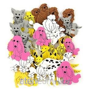 Zestaw naklejek z pianki z motywami psów, w kilku różnych wzorach i kolorach.