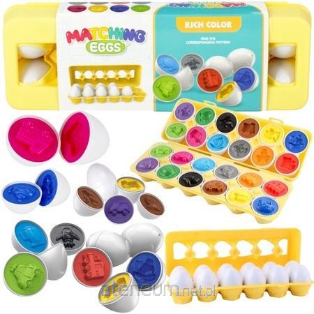 Nauka kształtów i kolorów: Dzięki kształtom na połówkach jajek, dzieci mają doskonałą okazję do nauki rozpoznawania różnych form i wzorów. Dodatkowo, różnorodność kolorów wspiera naukę rozpoznawania i nazewnictwa barw, co stanowi ważny element w edukacji przedszkolnej. Ta interaktywna metoda nauki zachęca dzieci do aktywnego uczestnictwa w zabawie i kreatywnego eksplorowania świata.