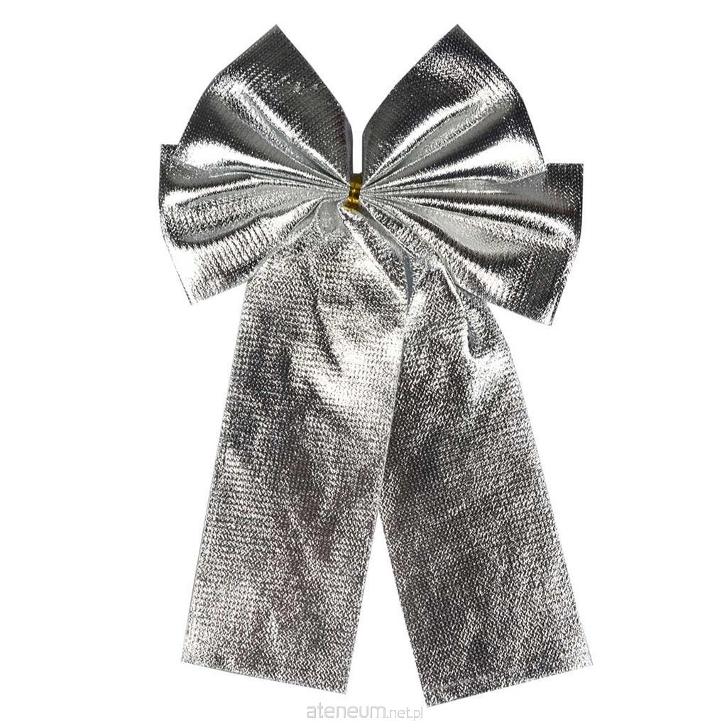 Duża kokarda dekoracyjna w kolorze srebrnym. Idealnie sprawdzi się w kompozycjach dekoracyjnych, świątecznych jak i do dekoracji prezentów. Ozdoba świąteczna o wymiarze: 15 x 23 cm.