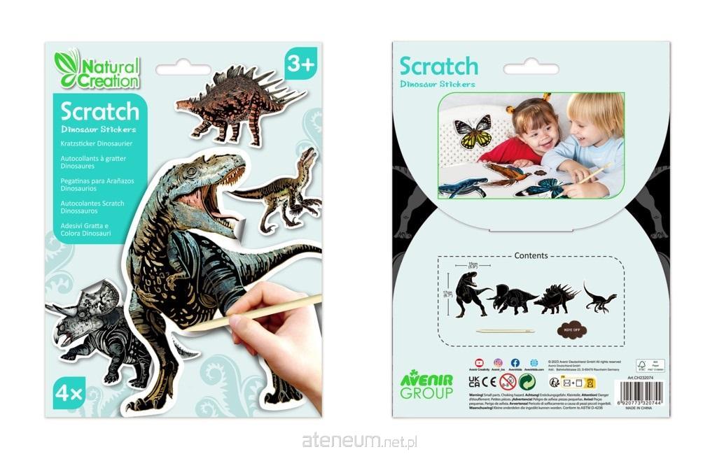 Dzieci będą miały mnóstwo frajdy, drapiąc wzory na naklejkach!Można je przykleić na dowolnej powierzchni i można je łatwo usunąć. W zestawie 4 sztuki tematycznych naklejek, drewniany rysik do zdrapywania oraz ściereczka.