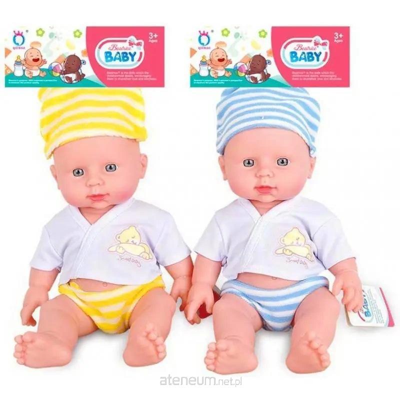 Lalka w niebieskiej piżamie pije, butelka, nocnik