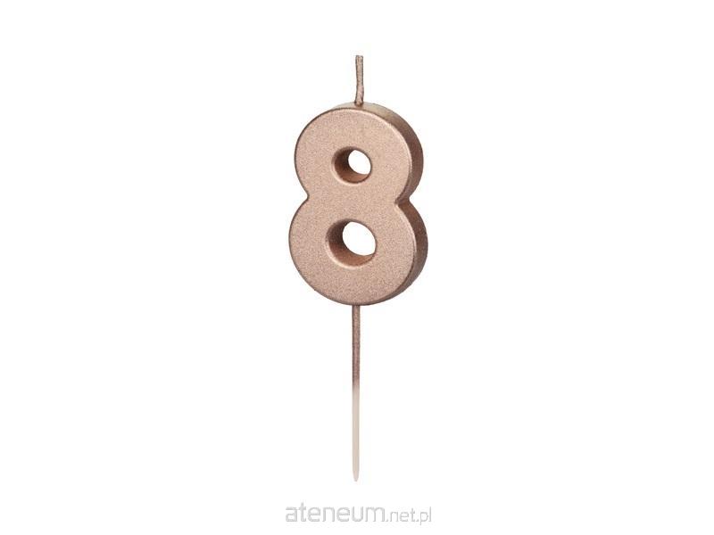 Świeczka urodzinowa Cyferka 8 w kolorze różowego złota na drewnianym patyczku, wysokość cyfry ok. 4.5 cm, wysokość całkowita ok. 9 cm.