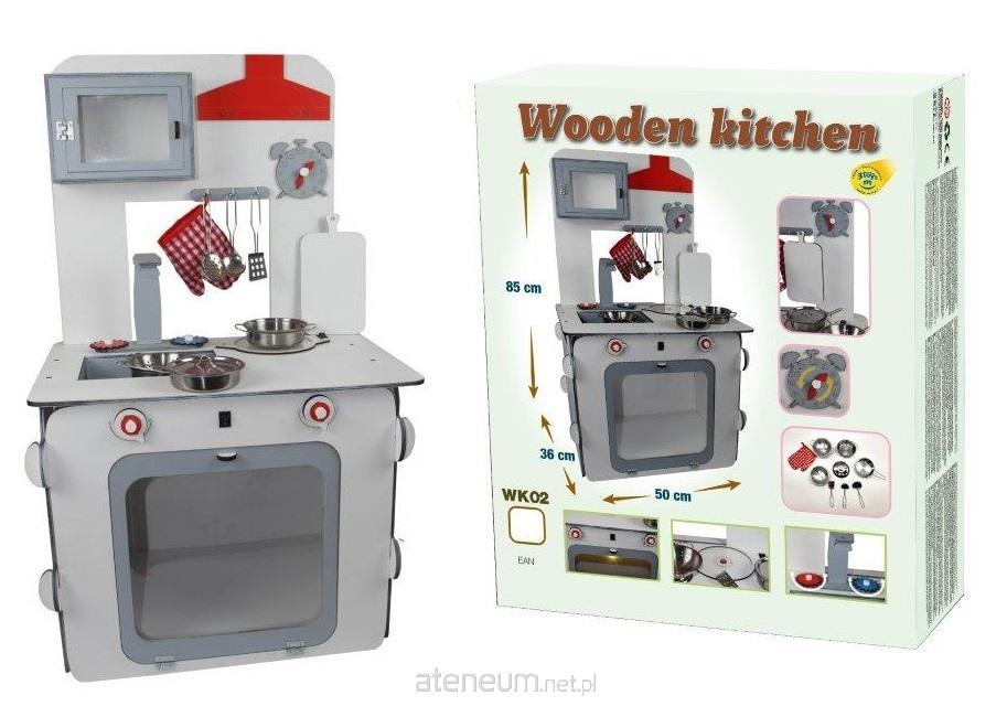 DUŻA, drewniana, kolorowa kuchnia! Kuchnia zawiera, zestaw garnków i narzędzi ze stali nierdzewnej, zegar z ruchomymi wskazówkami, mikrofalę , okap, imitacja palnika z włącznikiem światełka, piekarnik ze światełkiem, kran z zębatkami ruchomymi imitującymi kurki oraz materiałową rękawicę kuchenną. Całość znajduje się w kolorowym opakowaniu.
