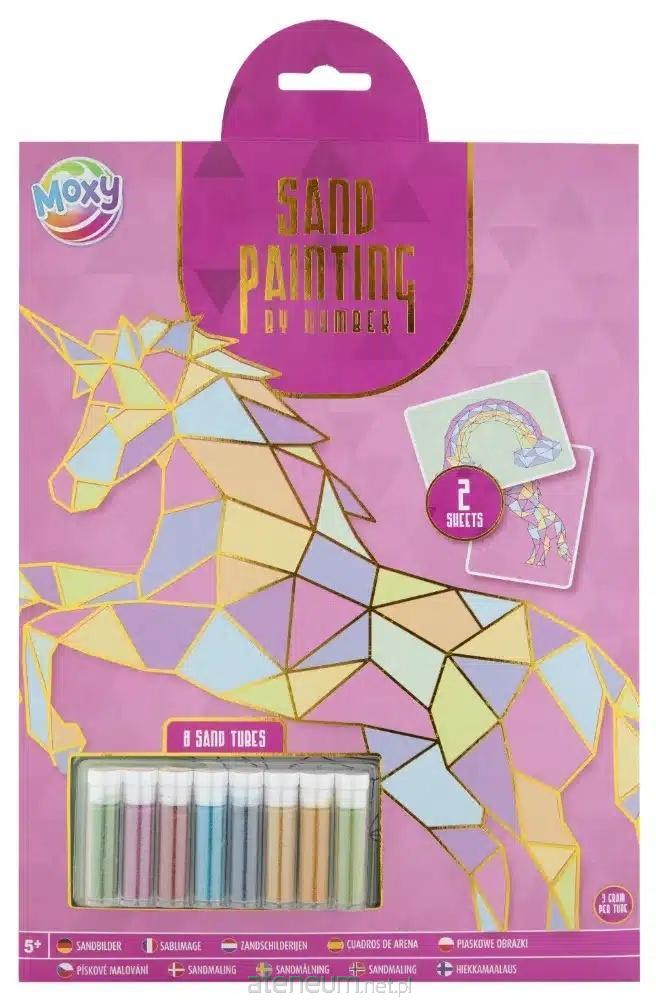 Malowanie piaskiem po numerach, na formacie A4. Wariant: Jednorożec. W zestawie 8 fiolek kolorowego piasku niezbędnego do wypełnienia kolorem pokrytych klejem obrazków. Super kreatywna zabawa dla dzieci powyżej 5 lat.