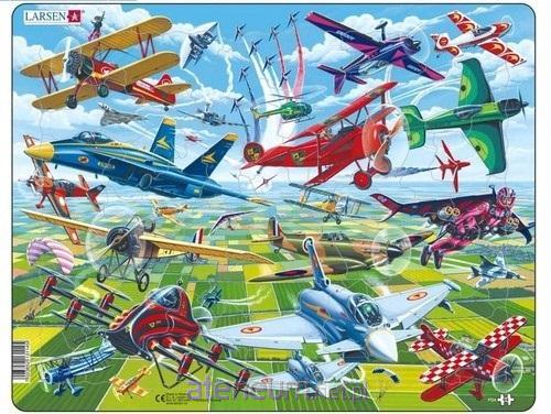 Oto układanka z niesamowitą mieszanką samolotów w spektakularnym pokazie lotniczym. Dołączyliśmy multicopter i skrzydlaty jetpack, aby pokazać innowacje techniczne, które są w trakcie rozwoju i które, jak wierzymy, pojawią się w przyszłości. W lewym górnym rogu widać dwupłatowiec Boeing Stearman z USA z lat 30-tych, z panią stojącą na szczycie samolotu. Są tu dwupłatowce i trójpłatowiec, paralotnia i helikopter. Samoloty myśliwskie i bombowce pomalowane są świeżymi, przyjaznymi kolorami. Wiele elementów jest wyciętych wzdłuż konturów obrazka, a niektóre kawałki mają kształt samolotów. Puzzle z 64 elementami najlepiej nadają się dla nieco starszych dzieci.