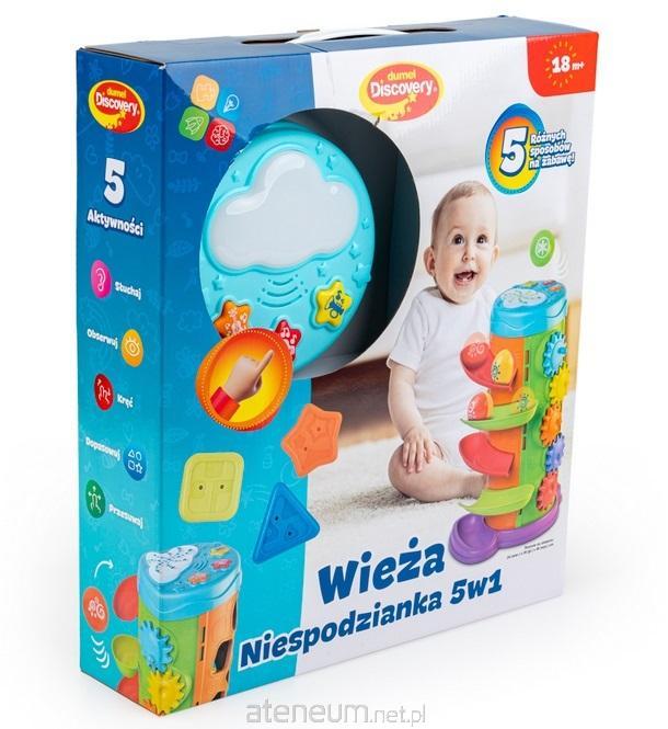 Wysoka wieża skrywa wiele sensorycznych skarbów! Na każdej ze stron znajduje się tu inna zabawa, która pozwoli dziecku ćwiczyć motorykę małą, poznawać zależności przyczynowo skutkowe i rozwijać zdolności poznawcze. Wśród kolorowych ścianek zabawki pochowało się 5 różnych zabaw: zjeżdżalnia z piłeczkami, trybiki do kręcenia, sorter kształtów z klockami do dopasowania, ruchome elementy do przesuwania i obracania, a także, na samej górze, urocza chmurka z przyciskami aktywującymi melodie i kolorowe, świetlne wzorki.