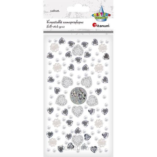 Kryształki samoprzylepne mix wzorów białe serca 17x17mm, kwiatki O13mm, perełki O6mm, lustrzane serca 10x10mm 118szt.
