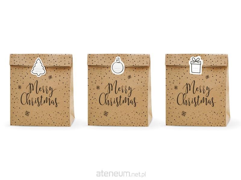 Torebki na prezenty Merry Christmas wykonane z kraftowego papieru z nadrukiem, zestaw zawiera 3 torebki i 3 naklejki, wymiary po złożeniu ok. 25 x 11 x 27 cm.(1 op. / 3 szt.)
