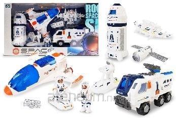 W zestawie: 3 figurki astronautów wys. 8 cm, 6-kołowa ciężarówka dł. 24 cm, rakieta wys. 24,5 cm, statek kosmiczny dł. 24 cm, kosmiczna lotnia wym. 12 x 19 cm, sonda kosmiczna dł. 9 cm, 2 mini pojazdy naziemne, funkcje: statek kosmiczny - 2 otwierane kabiny pilotów, ciężarówka - otwierana kabina kierowcy, ruchome elementy, rakieta - rozłącza się na 2 części: kapsułę powrotną i rakietę, otwierane 2 kabiny, figurki - ruchome elementy, wym. opak. 59,5 x 34 x 11 cm, 3+