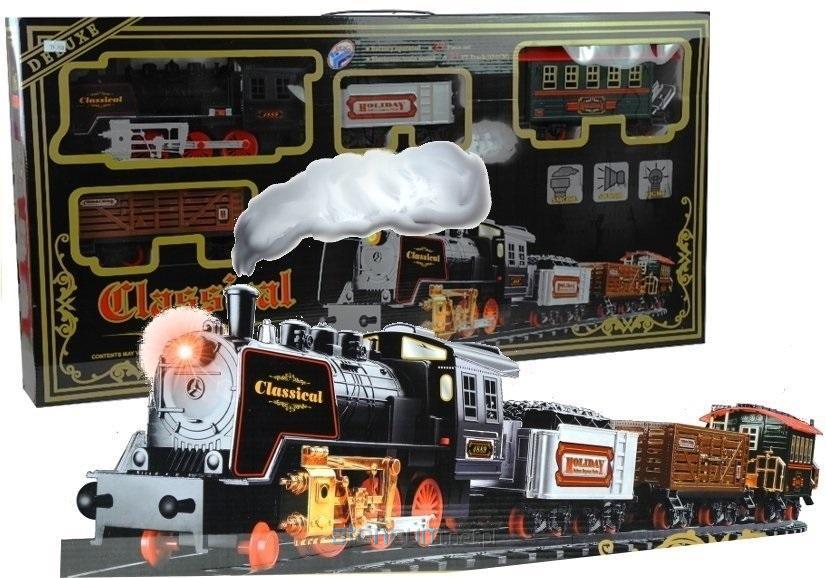 Kolejka elektryczna z wagonami Każdy z nas, nieważne - mały czy duży, uwielbia ekscytującą zabawę z wykorzystaniem kolejki i długich torów. Prezentowany zestaw składający się z 27 elementów jest znakomitą okazją do rozwinięcia wyobraźni i kreatywności dziecka, a także jego zdolności manualnych oraz koordynacji ruchowej. Ponadto jest to świetny sposób umożliwiający aktywne i niebanalne spędzanie wspólnego czasu rodziców z dziećmi. Niepowtarzalne emocje, jakie towarzyszą składaniu poszczególnych elementów torów i pociągu, to tylko wstęp do prawdziwej, rodzinnej rozrywki. Niesamowicie realistyczny wygląd kolejki, a także jej tory o imponującej długości, zachęcą każdego malucha do tej wspaniałej zabawy. Dlaczego warto wybrać właśnie ten zestaw? Ze względu na wzornictwo, jakość, a także rewelacyjne efekty. Zestaw składa się z: - lokomotywy, - 3 wagonów, - stacji kolejowej, - 22 różnych torów. Tory odznaczają się swą długością - łącznie osiągają aż 650 cm. Ich połączenie jest bardzo proste i bardzo trwałe. Co ciekawe - można układać je w przeróżnych kombinacjach, urozmaicając tym zabawę. Lokomotywa kolejki jeździ w przód i w tył, wypuszcza dym z komina, czemu towarzyszą realistyczne efekty dźwiękowe i świetlne. Wagony dołączone do zestawu można przyczepiać do kolejki według własnego pomysłu - mechanizm ten jest bardzo intuicyjny. W zestawie znajduje się również stacja kolejowa, która tworzy ten zestaw kompletną, niesamowicie ciekawą zabawką. Komplet elementów zapakowany jest w duże, eleganckie pudełko z witrynkami ukazującymi poszczególne wagony. Opakowanie posiada rączkę umieszczoną w górnej części pudełka, co sprawia, że przenoszenie zabawki jest lekkie - a złożona zajmuje bardzo mało miejsca. Zabawka przeznaczona jest dla dzieci powyżej 3. roku życia. Wykonano ją z trwałego materiału najwyższej jakości, dzięki czemu bawiąc się można mieć pewność, że kolejka posłuży maluchowi przez długi czas. Plastik ten posiada certyfikat bezpieczeństwa CE, gwarantujący spełnienie wymogów Unii Europejskiej. Elektryczna kolejka zasilana jest 6 sztukami baterii AA 1,5 V, które nie są dołączone do zestawu. Należy umieścić je w dolnej części największej kolejki, co dokładnie przedstawione jest w dolnej części kartonu. Wymiary elementów: - lokomotywa: 30 cm x 8,5 cm x 13,5 cm, - wagon srebrny: 16 cm x 9 cm x 9,5 cm, - wagon zielony: 22 cm x 8,5 cm x 13 cm, - wagon brązowy: 22,5 cm x 8 cm x 9 cm, - stacja: 16,5 cm x 7 cm x 5 cm. Wymiary opakowania kolejki: - 84,5 cm x 42 cm x 11 cm.