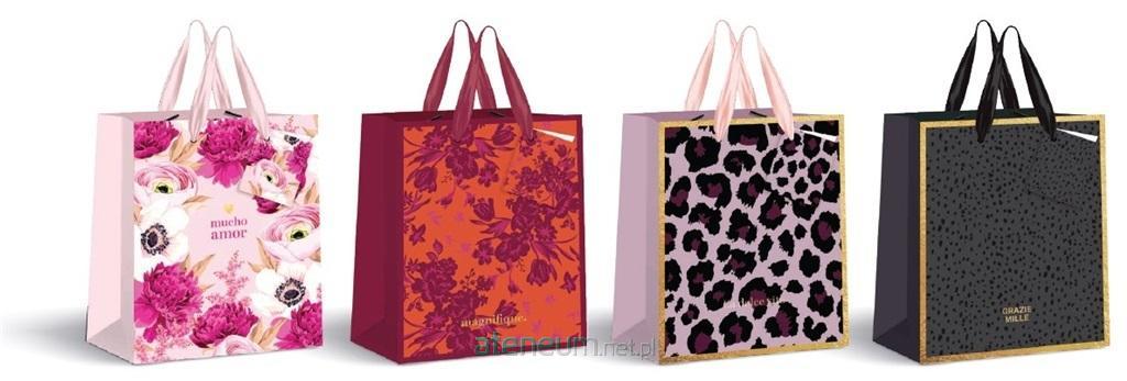 Wykonana z wysokiej jakości papieru 190 g. Eleganckie, matowe wykończenie. Wzmocniony, sztywny spód. Bilecik z miejscem na życzenia lub imię obdarowywanej osoby. Uchwyty wykonane z atłasowej wstążki. Idealna do szybkiego i efektywnego pakowania prezentów. Wymiar: 18x23x10 cm.