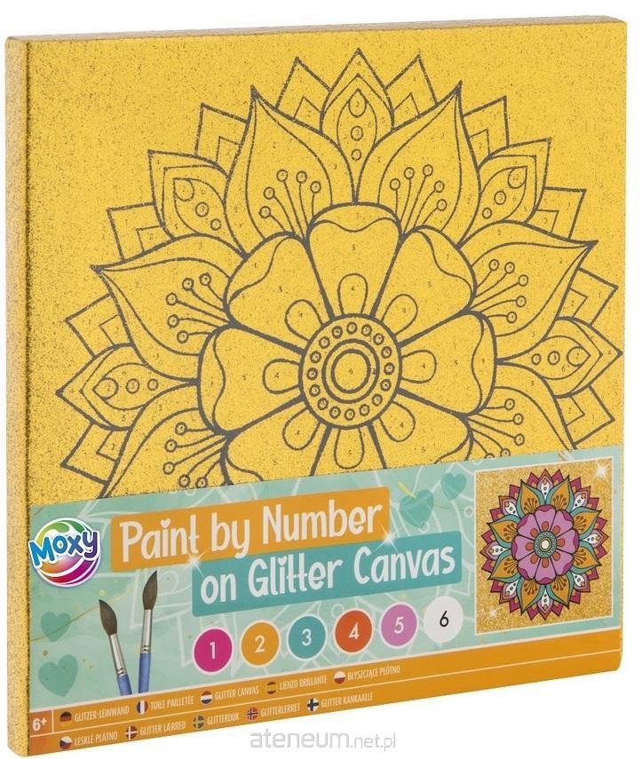 Malowanie po numerach, na płótnie brokatowym, o wymiarach 25x25 cm. Dostępne 3 rodzaje: Zółw, Jednorożec, Mandala kwiatowa