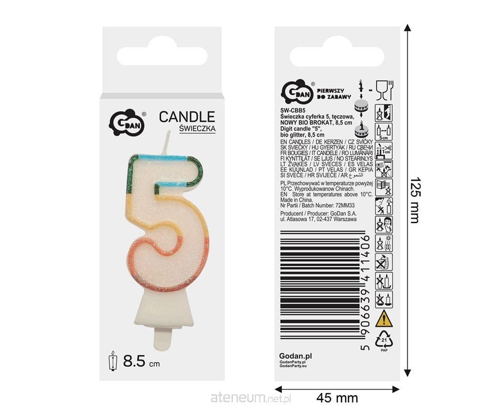 ŚWIECZKA CYFRA 5, TĘCZOWA, BIO BROKAT