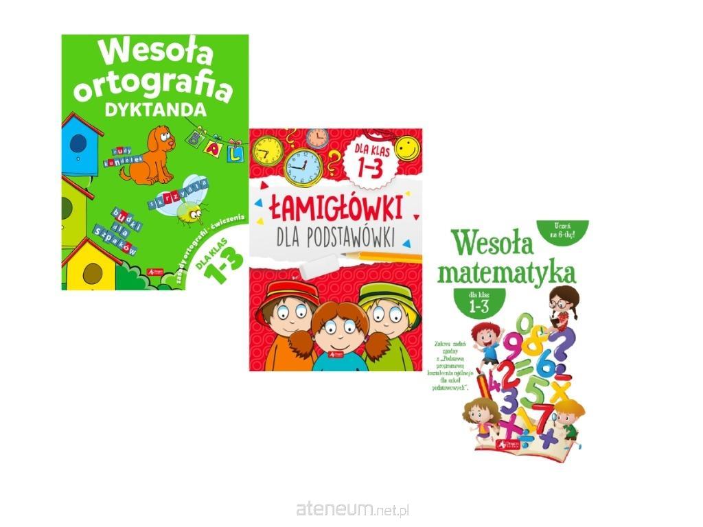 "Wesoła matematyka dla klas 1-3" to książka edukacyjna przygotowana z myślą o dzieciach, które dopiero rozpoczęły swoją przygodę w szkole. To obszerny zbiór ciekawych zadań, które kształtują wiadomości i umiejętności matematyczne dzieci, a także uczą samodzielnego myślenia. Zakres prezentowanych zadań jest zgodny z treściami nauczania zawartymi w "Podstawie programowej kształcenia ogólnego dla szkół podstawowych"."Wesoła ortografia" to książka edukacyjna przygotowana z myślą o dzieciach, które rozpoczynają swoją przygodę w szkole. Jest to obszerny zbiór dyktand i ćwiczeń, dzięki którym początkujący uczniowie łatwo nauczą się zasad ortograficznych oraz utrwalą zdobyte umiejętności. Książka stanowi doskonałe wsparcie procesu dydaktycznego.