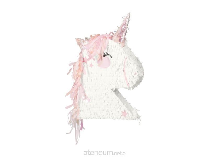 Piniata składana w kształcie głowy jednorożca, mix kolorów, do wypełnienia upominkami, słodyczami lub płatkami kwiatów. Wymiary po złożeniu ok. 41 x 48 x 10 cm.