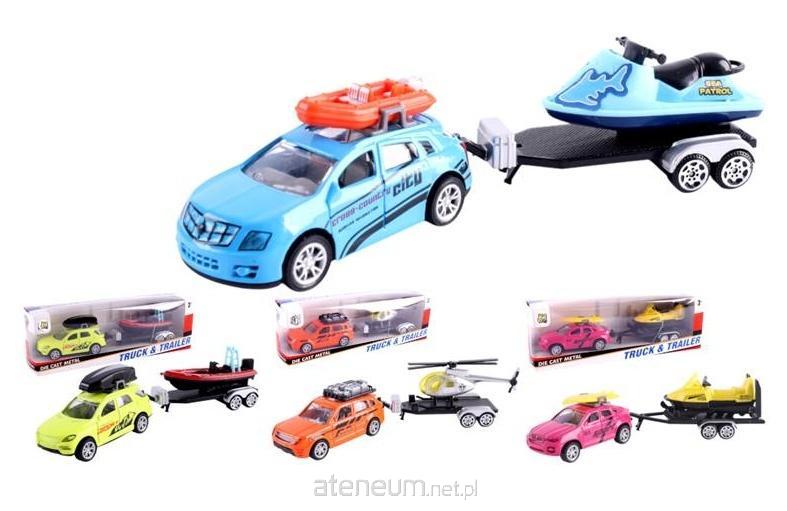 Zawartość zestawu: samochód osobowy + przyczepa z dodatkiem (np. helikopter, skuter wodny, łódź motorowa).