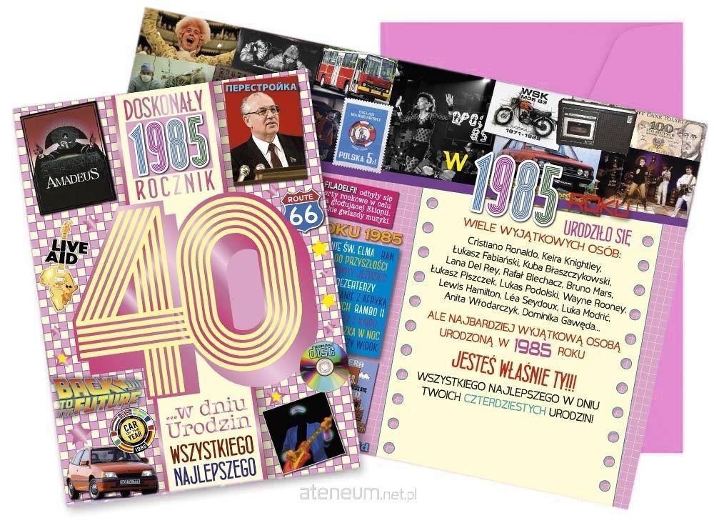 Karnet Vision "Urodziny 40" V-119 Kartka z serii To Był Rok, w której w środku i na froncie znajdują się ciekawe wydarzenia z danego roku. Wykonane z niezwykłą dbałością o szczegóły, zdobione folią holograficzną i w całości pokryte folią matową dla podkreślenia efektu prostoty i elegancji. Każdy karnet zawiera w środku starannie dobrane życzenia oraz dopasowaną kopertę. W powiększonym formacie 140x190 mm. Cechy szczegółowe: wnętrze: kolorowe, wyjątkowe życzenia w środku, w komplecie: dopasowana kolorystycznie koperta. wymiary kartki 14 x 19 cm okazja: urodziny