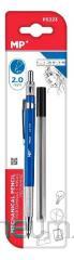 Metaliczny ołówek automatyczny z przyciskiem, klipsemi chromowaną skuwką. Z regulowanym okienkiem z ołowianym wskaźnikiem podziałki. Temperówka i gumka na guzik. Przewód HB 2 mm. Zawiera futerał z 5 sztukami 2mm wkładów HB. Blister1 sztuki.