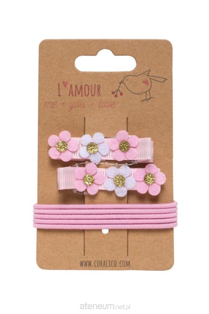 Zestaw klipsów z kwiatkami i gumki. Odcienie różu, bieli i złota