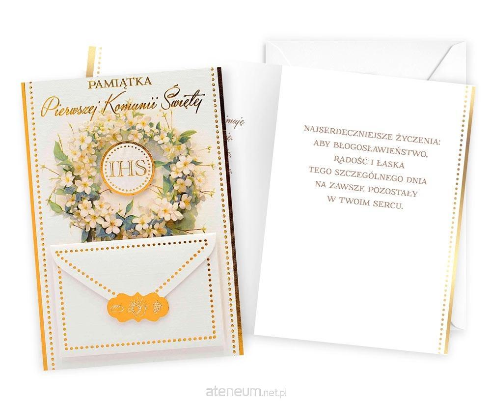 Kartka Dream Cards na I Komunię Świętą DK-1241 Kartka B6 z ozdobnej serii Dream Cards - nieduża, ale robi wrażenie dzięki atrakcyjnej kolorystyce i ciekawym zdobieniom. To idealny wybór łączący przyjazną cenę z jakością. Cechy szczególne: wielkość: B6, 16.6 x 11.7 cm po złożeniu, koperta: w zestawie, kolorowa, zdobienia: kolorowe, różnorodne, bogate (w zależności od wzoru: przyklejane dekoracje, elementy biżuteryjne, odstawniki, metaliczne folie, tłoczenia itp.), okazja: Komunia Święta