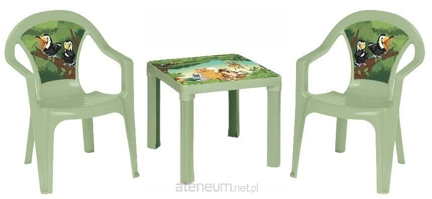 Zestaw: stolik i dwa krzesła, kolor PASTEL Zielony, wtopiona etykieta IML z kolorowym motywem w blat stolika i oparcie krzesła uniemożliwa jego odklejenie i gwarantuje wysoką odporność na warunki atmosferyczne, do stosowania zarówno na zewnątrz, jak i wewnątrz
