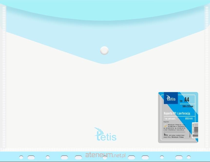 Koperta PP na zatrzask z europerforacją, mieszcząca format A4. Wymiary:308x235 mm, grubość: 0,2 mm. Opakowanie: folia 6 sztuk.