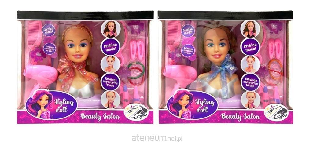 Lalka do stylizacji włosów z różnymi akcesoriami, takimi jak grzebień, suszarka do włosów, spinki i wiele innych