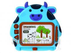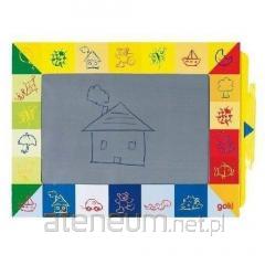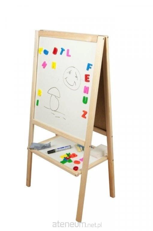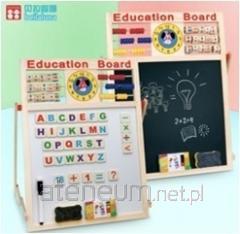 Magnetyczna dwustronna tablica drewniana- naturalna, rozkładana. Wyposażona w zegar (ruchome wskazówki) i alfabet. Gąbka, kreda. Tablica zawiera marker.
