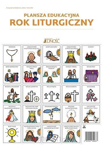Plansza edukacyjna Rok liturgiczny to pomoc dla katechetów w przeprowadzaniu lekcji poświęconych okresom liturgicznym w Kościele. Zawiera schemat kołowy roku liturgicznego z zaznaczonymi okresami liturgicznymi w charakterystycznych dla nich kolorach. Do schematu dołączona jest karta z symbolami PCS przedstawiającymi święta i uroczystości kościelne (do wycięcia). Symbole PCS ułatwiają porozumiewanie się osobom używającym komunikacji wspomagającej i alternatywnej. W trakcie zajęć dziecko umieszcza poszczególne symbole PCS w odpowiednich miejscach na schemacie roku liturgicznego. Plansza może być wykorzystywana jako samodzielna pomoc edukacyjna lub integralna część publikacji Rok liturgiczny z kartami pracy. Karty pracy dla uczniów z niepełnosprawnością intelektualną w stopniu umiarkowanym i znacznym ze znakami PCS, cz. 1 i 2. Można się nią posługiwać zarówno w klasie, jak i w indywidualnej pracy z uczniem.
