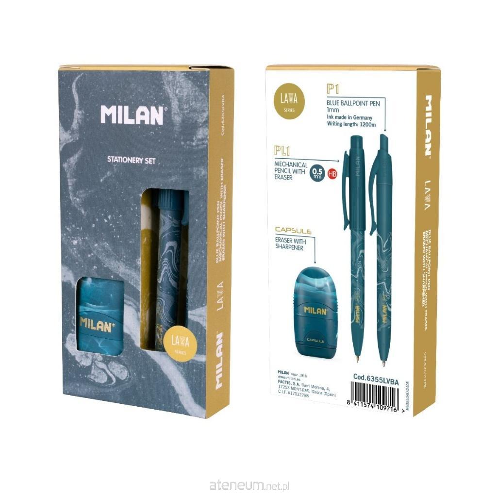 Zestaw do pisania z serii Lava, która jest inspirowana erupcjami wulkanów i ruchem stopionej skały, idealny na prezent. Zestaw zawiera: długopis P1 z niebieskim tuszem, ołówek automatyczny z grafitem HB 0,5 mm, który tworzy cienką linię i jest średnio twardy i posiada na końcu wykręcaną długą gumkę do wymazywania oraz temperówko-gumkę CAPSULE na cienkie kredki i ołówki z pojemnikiem na ścinki i bezpiecznym ostrzem. Wszystko to oryginalne produkty stworzone przez własny dział badawczo - rozwojowy MILAN. Rozmiar opakowania: 14,5 x 7,3 x 2,5 cm. Rozmiar długopisu: 14,1 x 1,7 cm. O 1 cm. Rozmiar ołówka: 14,4 x 1,5 x 1,1 cm. Rozmiar temperówko-gumki: 6.5 x 3.5 x 2.4 cm. Dostępne zapasowe gumki do temperówki i ołówka. Kolor niebieski.