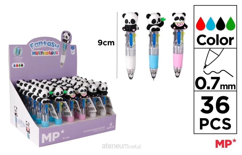Mini kolorowe długopisy 0.7mm z uroczymi figurkami pand. 3 różne wzory. Każdy długopis pisze w 4 kolorach: czerwonym, niebieskim, czarnym i zielonym. Silikonowy uchwyt dla wygodniejszego pisania. Długość 9cm. Display 36szt