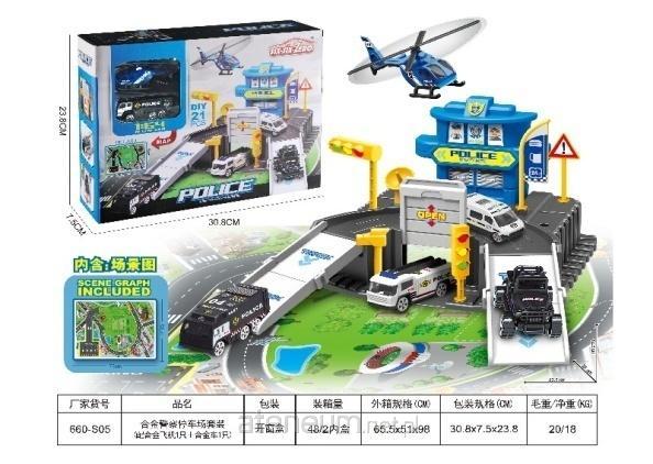 Parking policyjny z matą posiadający metalowe auta łącznie 24 elementy