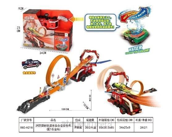 Tor z wyrzutnią o długości 130cm, posiadający auto które po zetknięciu z ciepła/zimną wodą zmienia kolor
