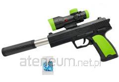W zestawie: karabin pneumatyczny wym. 39 x 18 x 4 cm, tłumik, celownik z magazynkiem na kulki hydrożelowe, paczka z kulkami hydrożelowymi, funkcje: by strzelić należy naciągnąć kurek, następnie nacisnąć spust, wym. Opak. 40 x 15 x 5,5 cm, 8+