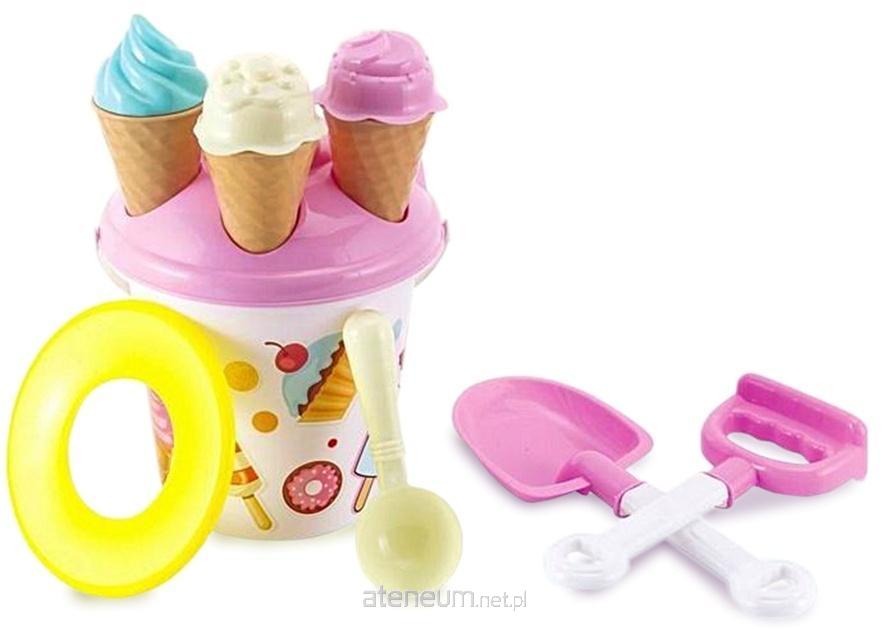 W zestawie: wiaderko do piasku wys. 16 cm, łopatka, grabki, łopatka do lodów, 3 foremki w kształcie lodów, podstawka na lody, pakowane w siatkę, wym. opak. 18 x 18 x 31 cm, 3+