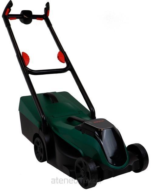 Kosiarka jest w kolorze ciemno zielonym z czarną rączką do prowadzenia i kolami. Koła są ruchome, więc kosiarka może poruszać się po różnych powierzchniach. Wnętrze kosiarki jest puste, dzięki czemu ma ona odpowiednią, niską wagę dla zabawy dzieci, a do jej ewentualnego przenoszenia na górze obudowy umieszczono specjalny uchwyt. Ważnym elementem tej kosiarki jest także zdejmowany kosz na odpady. Popularna zabawka ogrodnicza jest wyposażona w imitację elektrycznego rozrusznika umieszczonego na rączce kosiarki. Kosiarka podczas toczenia się wydaje realistyczne odgłosy terkotania, a koła przy poruszaniu dodatkowo wesoło dudnią. Czarny uchwyt w postaci rączki do prowadzenia kosiarki ma około 45 cm długości, co daje odpowiednio około 55 cm wysokości i 22 cm szerokości gotowego do zabawy sprzętu ogrodniczego. Kosiarka z pewnością spodoba się wszystkim dzieciom uwielbiającym zabawy w ogrodnika. Dzięki wysokiej jakości wykonania, zestaw będzie służyć przez długi czas.