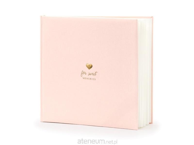 Księga Gości oprawiona papierem w kolorze pudrowego różu z napisem For sweet memories w kolorze złotym, wymiary ok. 20,5 x 20,5 cm, 22 kartki, bez tekstu.