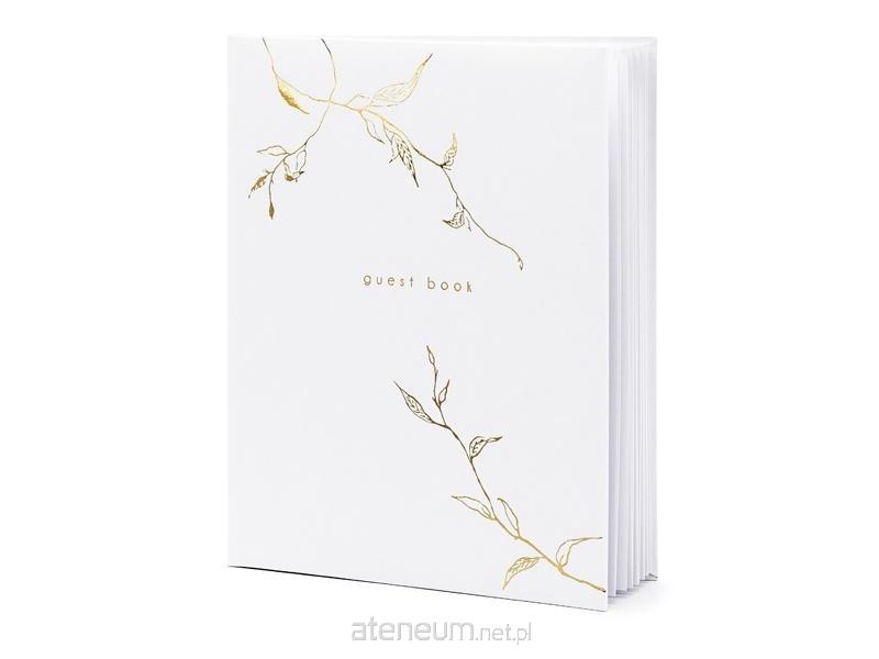 Księga Gości oprawiona papierem w kolorze białym, ze złotym wzorem Guest book, wymiary ok. 20 x 24,5 cm, 22 kartki, bez tekstu.