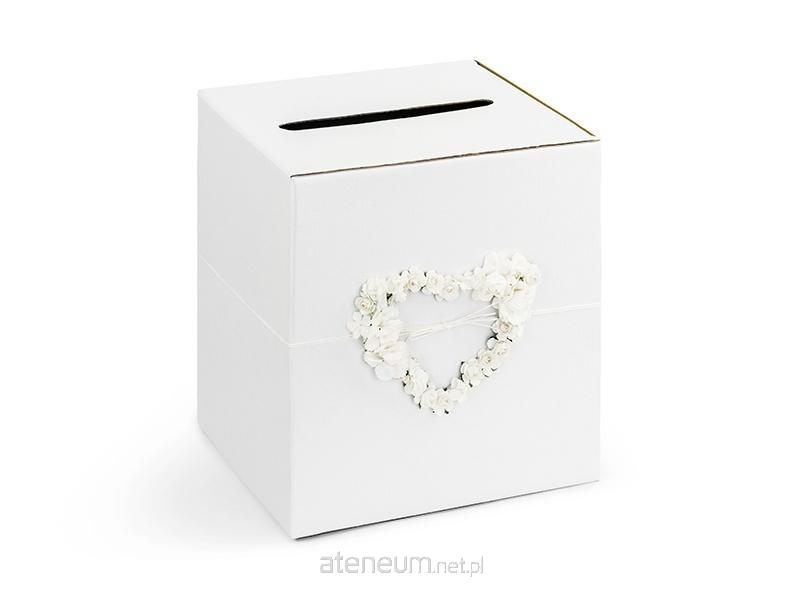 Pudełko na telegramy z perłowego papieru w kolorze białym, z kremowym kwiatowym sercem i lnianym sznureczkiem, Kolekcja Piękne Serce, wymiary pudełka po złożeniu 24x24x24 centymetra.
