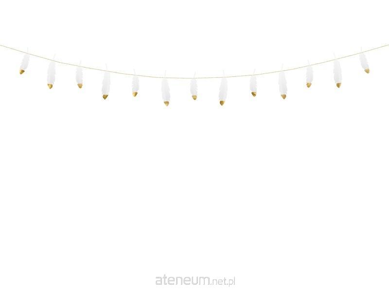 Girlanda przeszywana Piórka w kolorze białym ze złotymi metalizowanymi końcówkami, wymiary: wysokość ok. 13,5 cm, długość ok. 1,6 m.