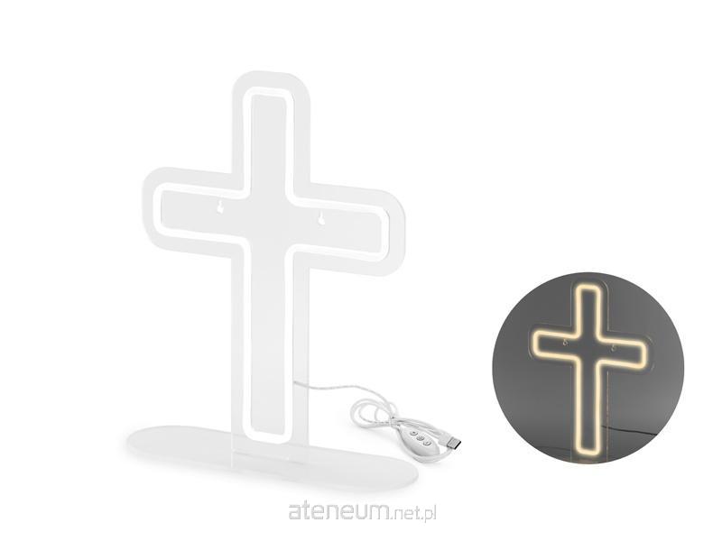 Neon LED - Krzyż w kolorze białym na przeźroczystym tle o ciepłej białej barwie światła. Rozmiar krzyża ok. 41x30 cm., długość kabla z wtyczką wynosi około 1,5 metra. Zestaw zawiera NEON, podstawkę i wieszak do mocowania na ścianie. Moc znamionowa wynosi 8-10W, napięcie znamionowe to 5V, a rodzaj wtyczki to USB.