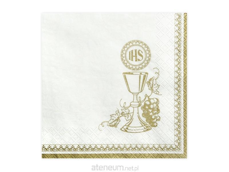 Serwetki trójwarstwowe Kielich w kolorze białym ze złotym nadrukiem, wymiary 33x33 centymetry.(1 op. / 20 szt.)